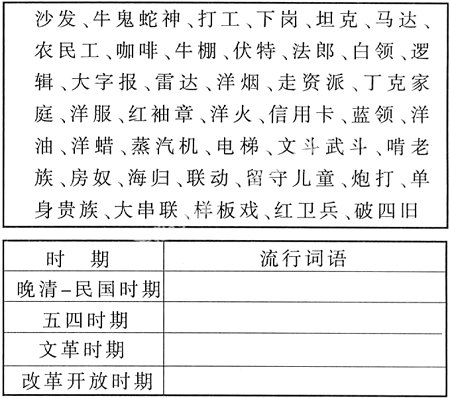 以下表中的四个时期为代表对近百年的流行词汇进行梳理。要求:对下列词语进行比较、筛选、推断,填入表格内。